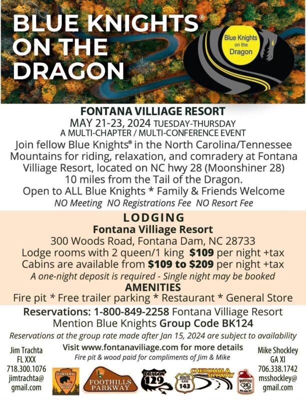 BLUE KNIGHTS ON THE DRAGONBKSCV Sanctioned Event.May 21 to May 23, 2024Fontana Village Resort. 300 Woods Road, Fontana Dam, NC 28733+ Add to Google Calendar+ iCal / Outlook export DateMay 21 - 23 2024Expired! Time All Day Category Blue Knight EventsShare this event